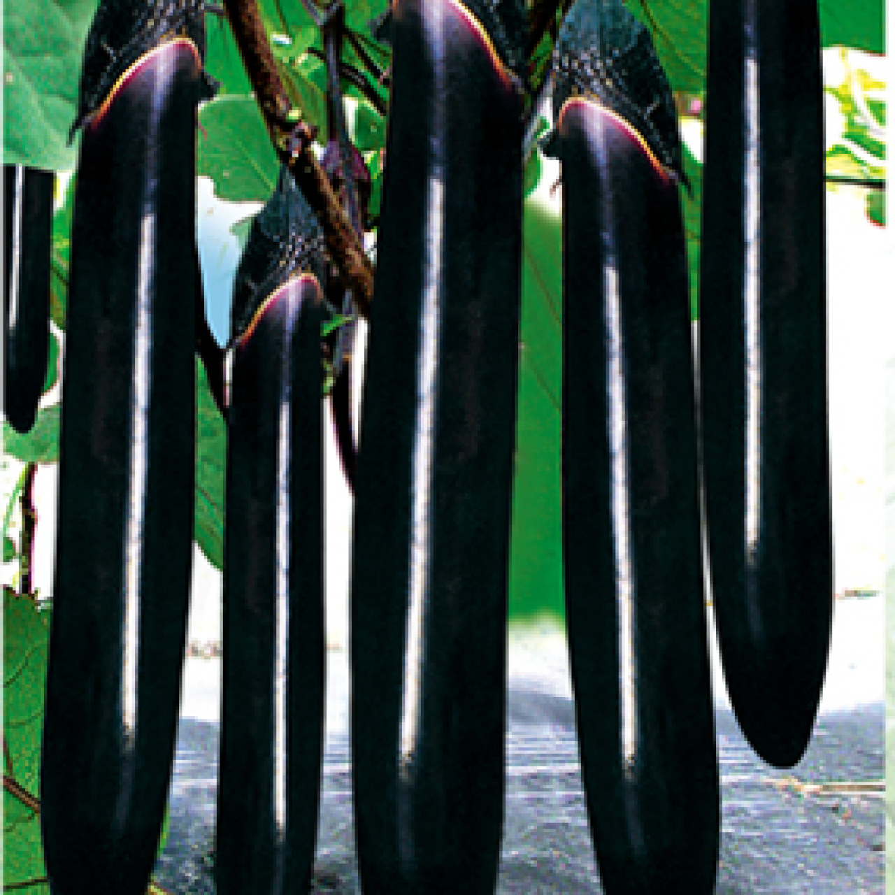 该品种亲本从韩国引进,经过多代杂交培育而成,抗病,高产,质优,商品性好,适应范围广等优点于一身,顶尖茄子新品种,植株生长旺盛,株型紧凑,坐果能力强,果实长条形,果肉淡绿色,果皮深紫色,光滑艳丽有光泽,顺直而美观,头尾均匀,具有很浓的茄香味,果长30-38厘米,果茎6厘米左右,单果重400-450g,采收期长,高温季节不变色,耐贮运,一般亩产一万公斤以上,耐热,耐寒,耐湿,抗青枯病,棉疫病,黄萎病等各种病害。